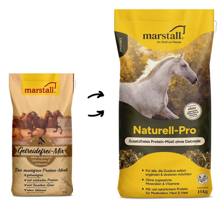 Für eine bedarfsgerechte Versorgung mit Mineralien, Spurenelementen und Vitaminen, empfehlen wir die Kombination mit einem Mineralfutter wie z.B. marstall Force.